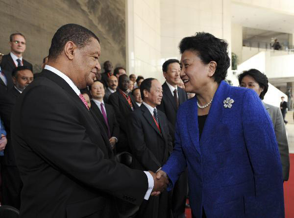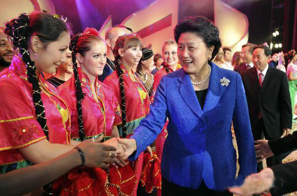 | Chinese State Councilor Liu Yandong shakes hands with overseas students after a performance in Beijing, capital of China, Sept. 29, 2010, to celebrate the 60th anniversary of New China's hosting of overseas students. |