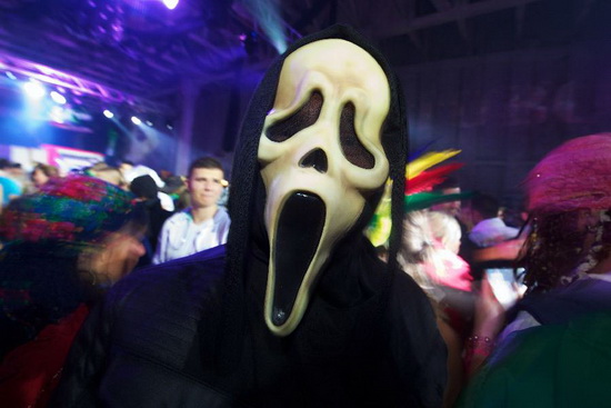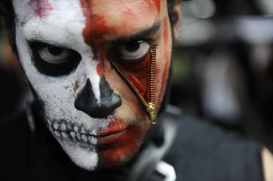 A man wearing Halloween costume poses during a Halloween Eve Party in Belgrade on October 30, 2011. Halloween is based on the Celtic festival of Samhain and the ancient Celts believed the border between this world and the otherworld became thin on that night, allowing spirits to pass through
