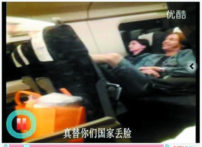 A video now going viral on iFeng.com shows a white blonde male putting his feet over the seat before him and a Chinese female passenger's head on a train from Shenyang to Beijing. It is not clear what happened before the start of this video, but the woman was clearly irritated by the man's behavior. She stood up, turned around, and hit the man's feet with a magazine, saying "you are a big shame to your country." ("你真给你国家丢人")