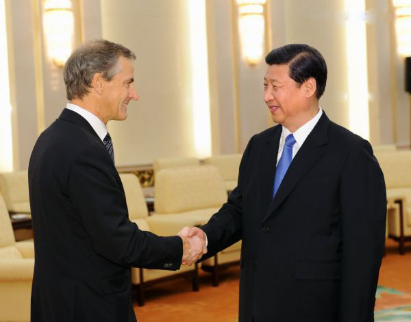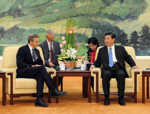 Chinese Vice President Xi Jinping (R) meets with Norway's Foreign Minister Jonas Gahr Stoere (L) in Beijing, capital of China, Aug. 30, 2010.