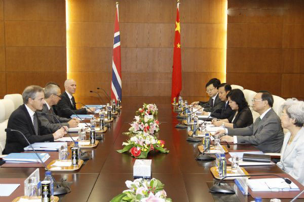 Chinese Foreign Minister Yang Jiechi (R) meets with Norway's Foreign Minister Jonas Gahr Stoere in Beijing, capital of China, Aug. 30, 2010.