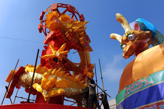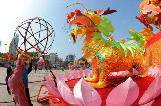 People work on a lantern in the shape of a dragon in Hangzhou, capital of east China's Zhejiang Province, Jan. 31, 2012, to celebrate the traditional Lantern Festival, which falls on Feb. 6 this year.