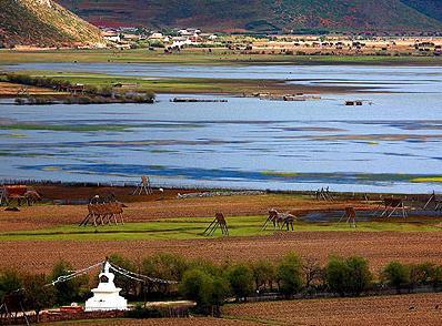 From September to October is high season to view Shangri-la when it is painted by golden Autumn; to be intoxicated with the alpine Autumn scenery, in particular the Longflower Stringbush, or alpine red flower in full blossom against the blue sky and drifting white clouds, knitting a fabulous Autumn scene.