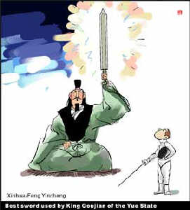 In December, 1965,  the famous bronze sword of Lord Gou was found in an acient aristocratic tombs in Hubei province. Archaeologists found a wooden box painted with black lacquer beside the mummy during excavation. And the luxurious bronze sword was placed in it. The sword and scabbard inosculated accurately. When the sword was drew out of the scabbard, to every one's superise, the sword was shining without any rust after being buryed in the tomb for thousands of years. They even did an experiment and cut a pile of paper breaking into two divides easily with the thin shap sword. Experts did a lot research and unscrambled the seal inscriptions carved on the sword and approved that it was the sword in Chinese ancient legend.